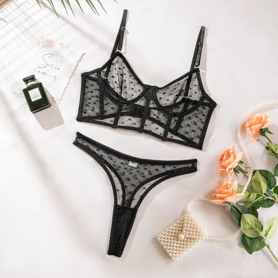 Sublimez vos courbes avec cet ensemble de lingerie en dentelle noire, à la fois raffiné et audacieux. Le bustier transparent à armatures offre un maintien élégant tout en dévoilant subtilement la peau grâce à sa résille plumetis. La culotte taille haute affine la silhouette pour une allure chic et sensuelle.
