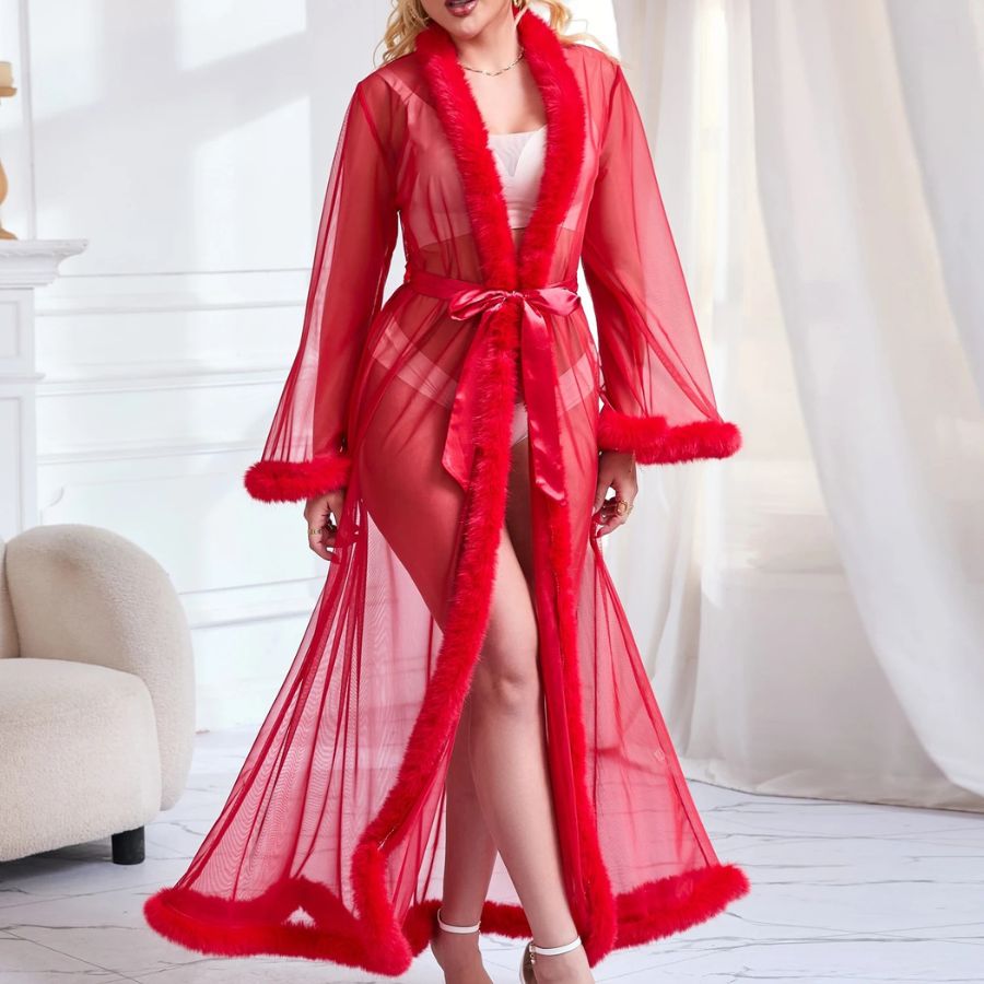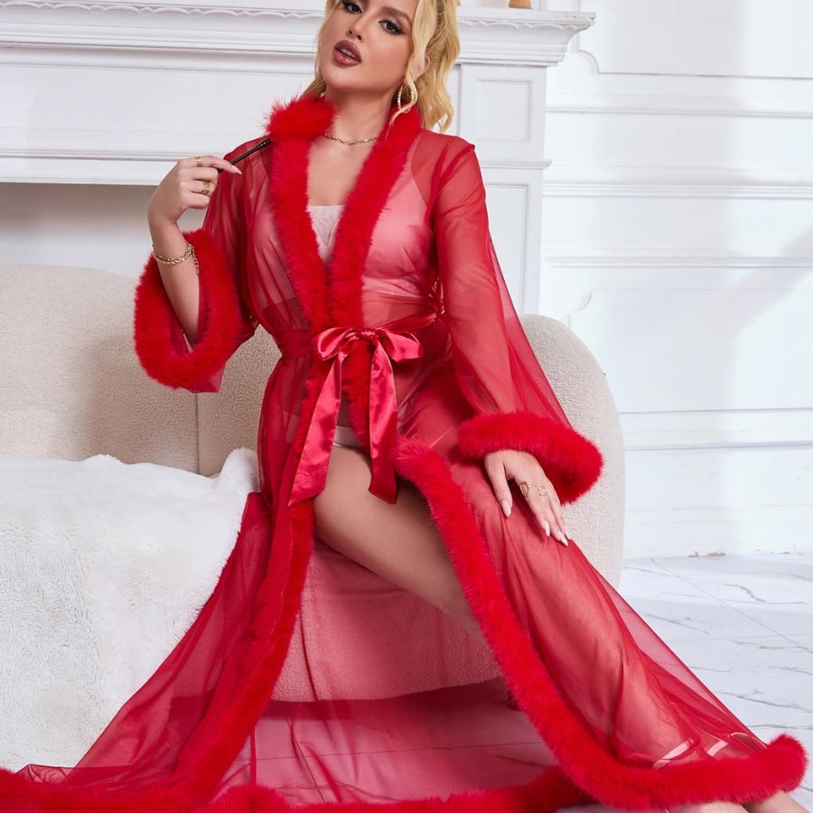 Faites sensation avec cette nuisette longue rouge sexy au charme envoûtant et à l’allure de femme fatale. Conçue en tissu transparent fluide, elle épouse délicatement les courbes et sublime la silhouette tout en légèreté. Les finitions en fausse fourrure au col, aux manches et à la base ajoutent une touche de glamour irrésistible. La ceinture satinée permet d’ajuster la taille selon vos envies pour un effet ultra sexy.