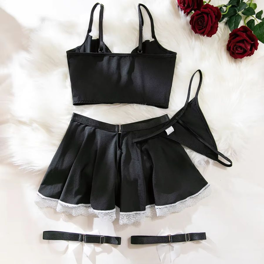 Faites sensation avec cet ensemble jupe noir à l’allure irrésistiblement élégante et audacieuse. Le soutien-gorge à armatures galbe la poitrine avec raffinement, tandis que la jupe fluide et son tablier en dentelle blanche offrent une touche rétro pleine de charme. Le string assorti et les jarretières ornées de nœuds blancs complètent parfaitement ce look dédié au jeu et à la séduction.