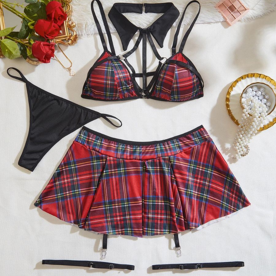 Jouez la provoque avec style grâce à ce déguisement écolière sexy à carreaux au charme irrésistiblement coquin. Le soutien-gorge triangle à fines brides structure la poitrine tout en laissant entrevoir juste ce qu’il faut, tandis que la mini-jupe plissée rouge à carreaux flatte la taille avec un effet évasé ultra séduisant. Le col noir façon uniforme et les jarretelles intégrées complètent l’ensemble pour une tenue aussi audacieuse que suggestive.