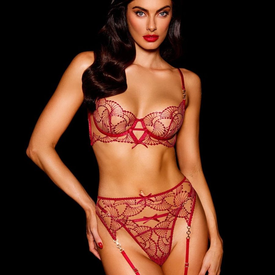 Envoûtez les regards avec cet ensemble porte-jarretelle chic en dentelle rouge. Le soutien-gorge à armatures épouse la poitrine avec raffinement, tandis que la culotte en tulle transparent rehaussée de broderies met en valeur les hanches avec sensualité. Les jarretelles ornées de détails dorés ajoutent une touche de luxe et permettent d’associer cet ensemble à vos bas préférés. Parfait pour incarner une femme fatale, cet ensemble marie élégance et séduction.