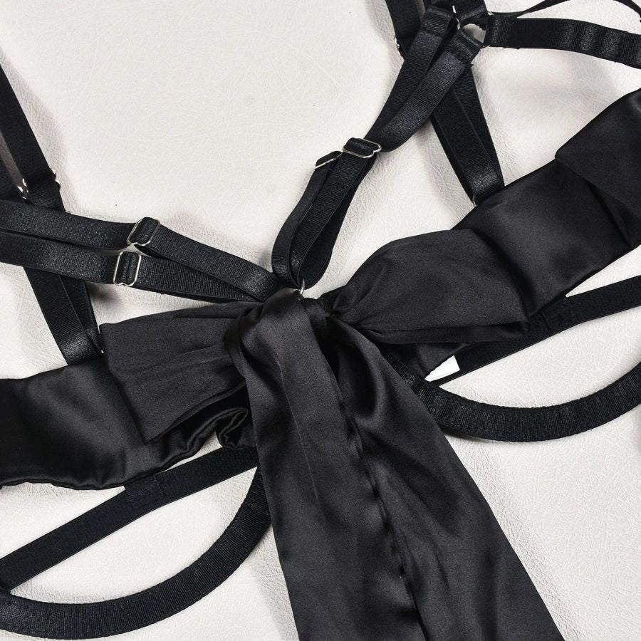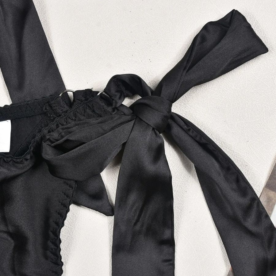 Succombez à l’élégance provocante de cet ensemble de lingerie 2 pièces en satin noir. Composé d’un soutien-gorge à armatures rehaussé de larges nœuds détachables et de fines sangles réglables, cet ensemble souligne le galbe du buste avec audace. Le string assorti, tout en finesse, s’attache délicatement sur les hanches, créant un effet de rubans cadeau ultra-sexy.