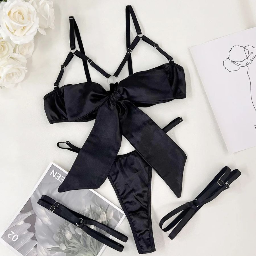 Sublimez vos courbes avec cet ensemble de lingerie en satin noir au style résolument glamour. Composé d’un soutien-gorge orné d’un large nœud central détachable, d’un string et de jarretières réglables, chaque pièce épouse parfaitement le corps et met en valeur la silhouette avec audace.