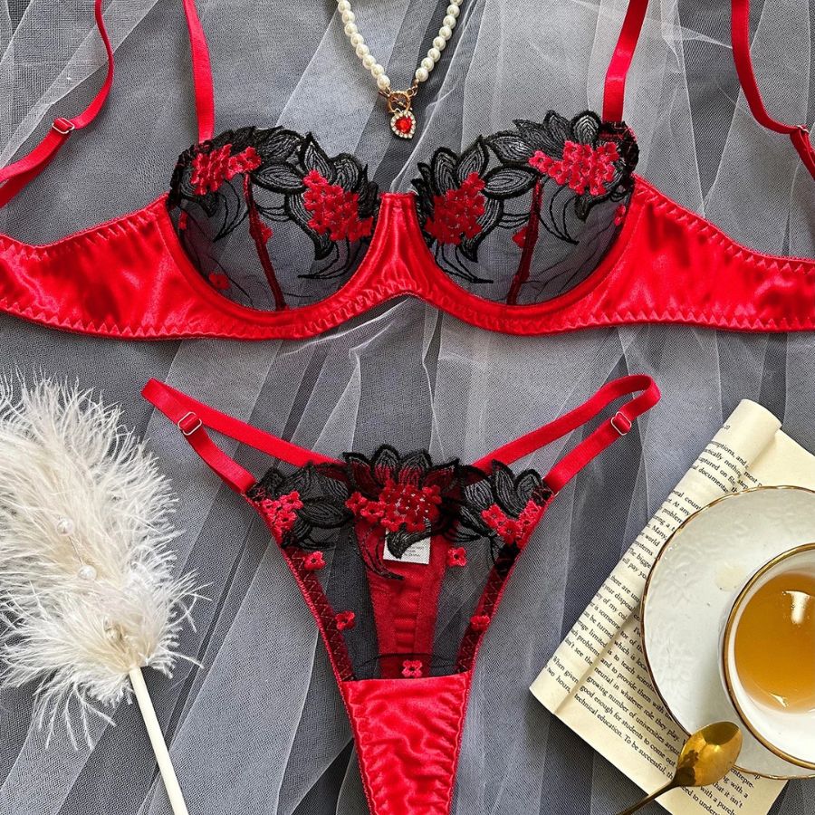 Sublimez votre silhouette avec cet ensemble de lingerie en dentelle rouge et noir au charme envoûtant. Le soutien-gorge à armatures dévoile le buste avec sensualité, tandis que le string assorti joue avec la transparence de la dentelle pour un rendu irrésistiblement glamour. L’alliance du satin rouge et des broderies noires crée un contraste élégant et audacieux.