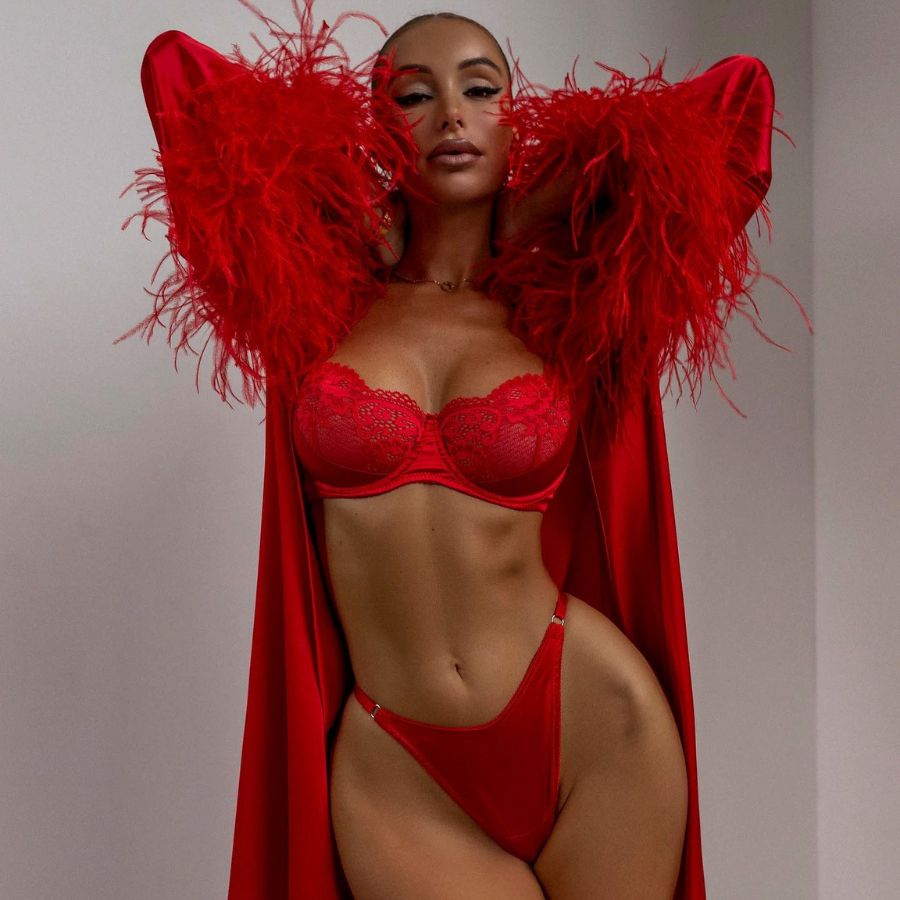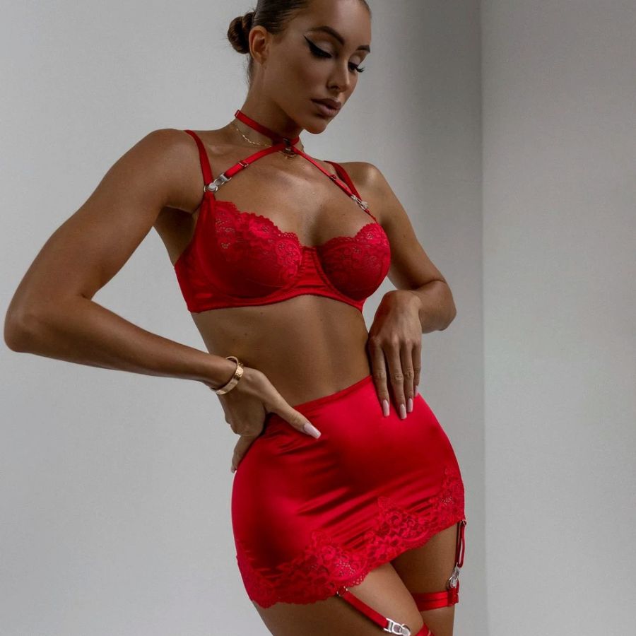Envoûtez les regards avec cet ensemble de lingerie jupe en satin et dentelle rouge, pensé pour révéler toute votre élégance. Composé d’un soutien-gorge à armatures rehaussé de dentelle florale, d’une jupe porte-jarretelle ouverte à l’arrière, et de jarretières assorties, cet ensemble évoque la séduction d’une femme fatale assumée.