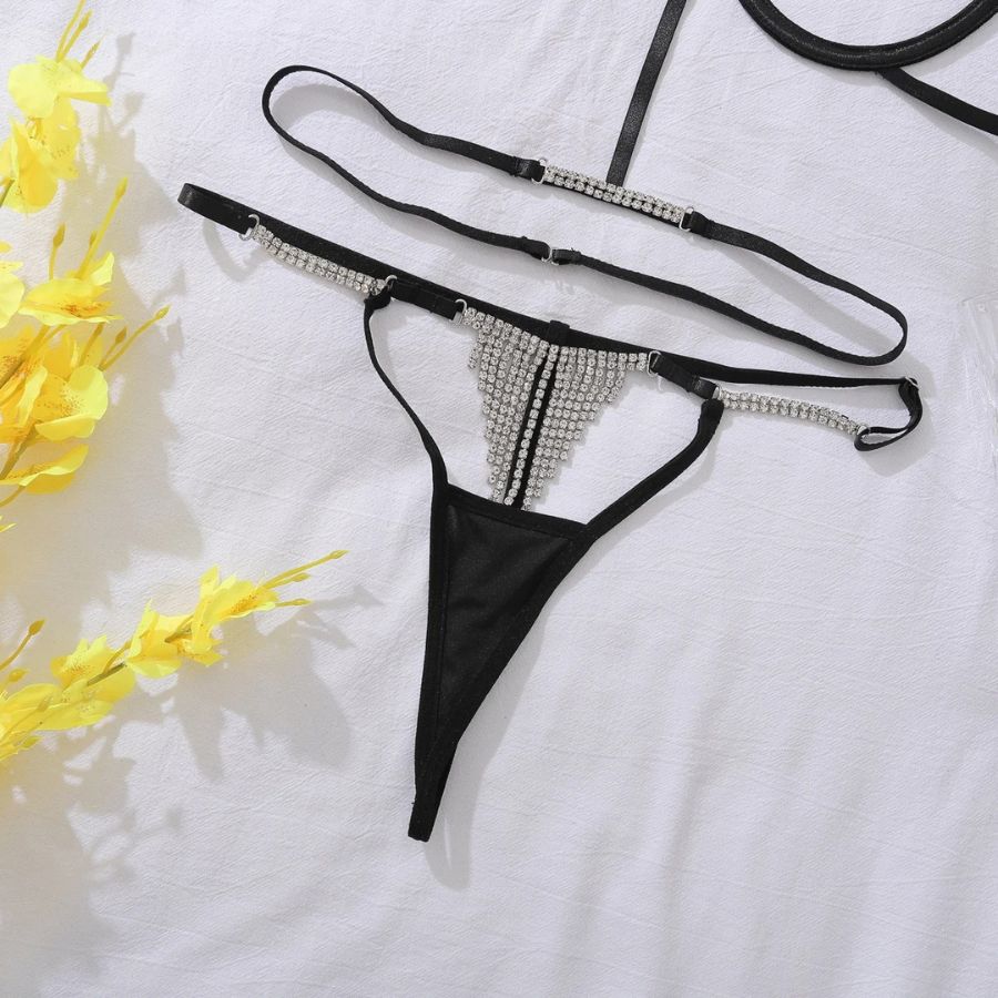 Sublimez vos courbes avec cet ensemble de lingerie noir orné de strass, fusion parfaite entre sensualité et éclat. Le soutien-gorge ouvert met en valeur la poitrine avec ses délicates chaînes scintillantes, tandis que le string coordonné souligne la silhouette avec audace. Chaque détail bijou apporte une touche glamour irrésistible, idéale pour un style provocant et raffiné.