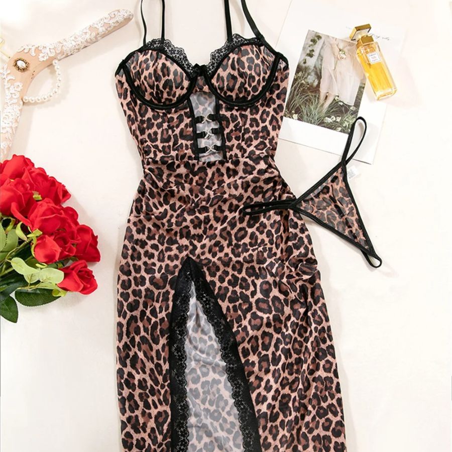 Faites sensation avec cette nuisette léopard sexy en satin et dentelle, parfaite pour un style glamour et irrésistible. La coupe ajustée met en valeur chaque courbe et galbe délicatement la poitrine. La fente haute bordée de dentelle allonge la silhouette, et le string coordonné complète l’ensemble pour une allure séduisante et sophistiquée.